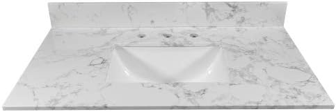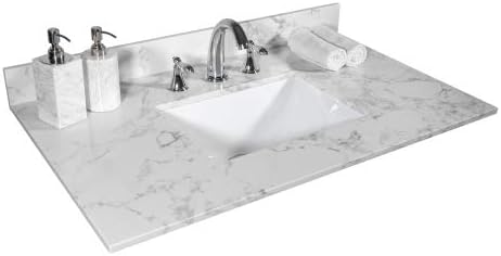 The vanity tops are made of beautiful Engineered stone. All exterior sides are polished for a luxurious look Each model is complemented with a ceramic Rectangle undermount sink. The matching backsplash is included in each package. Product incude : Stone vanity top + backsplash+ceramic sink [DIMENSIONS] Exterior Dimension 31" wide x 22" deep Fits Most Standard 30-in W x 21-in D vanity cabinet 4 inches center faucet holes Material Enginnered tone Stone top [Easy to Installation] Top pre-drilled for 8-inch widespread faucet Assembled stylish rectangular white vitreous china under mount bowl with safety overflow hole This top is perfect for quick and easy remodels Obtain the beauty and durability of marble without hiring a professional Elegant & Stylish TopWarmly elegant and stylish Carrara marble vanity top complement most Bathroom designs and coordinate with both light and dark cabinetry High-end and classic natural stone top Pre-sealed and Polished for added protection