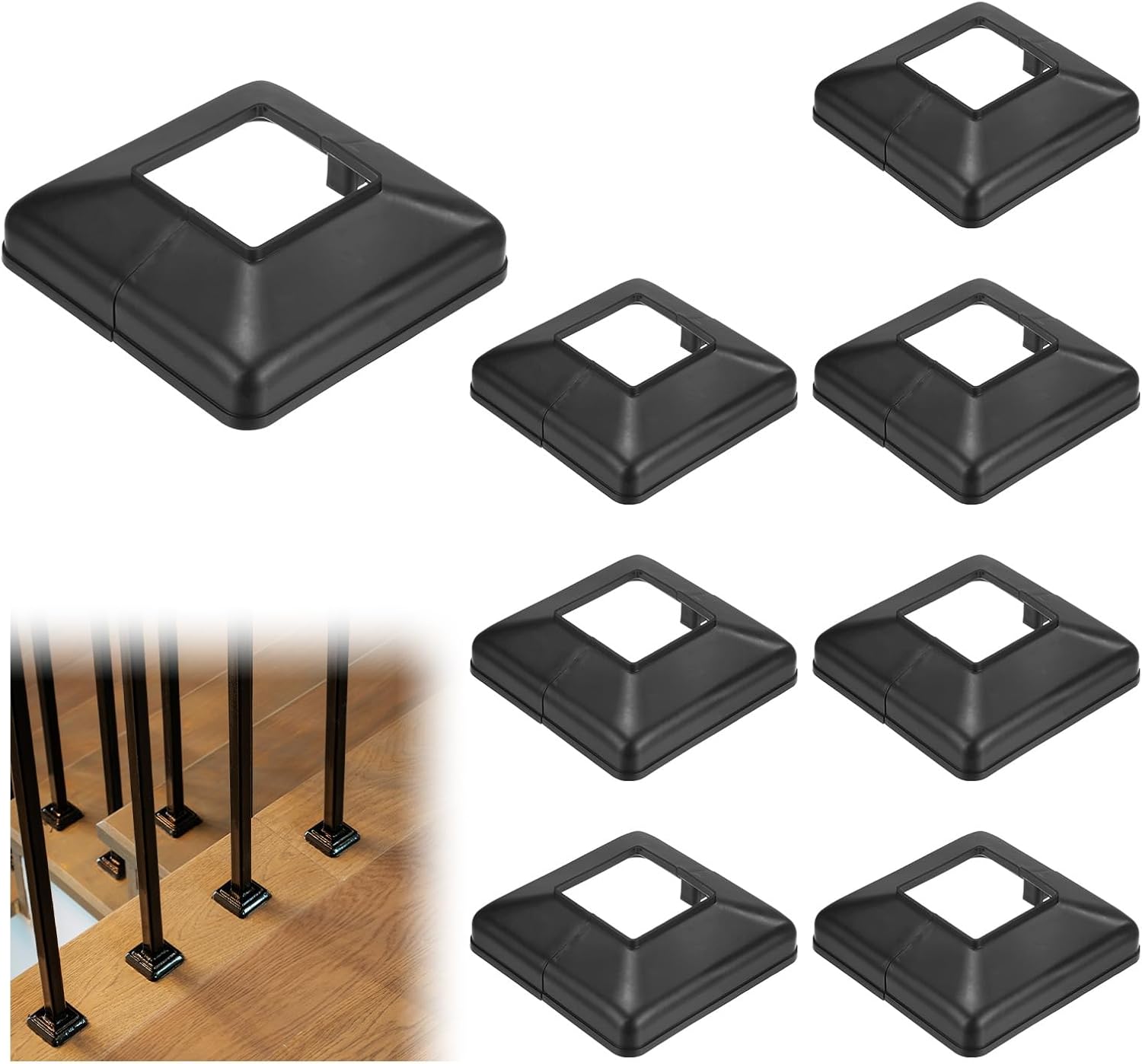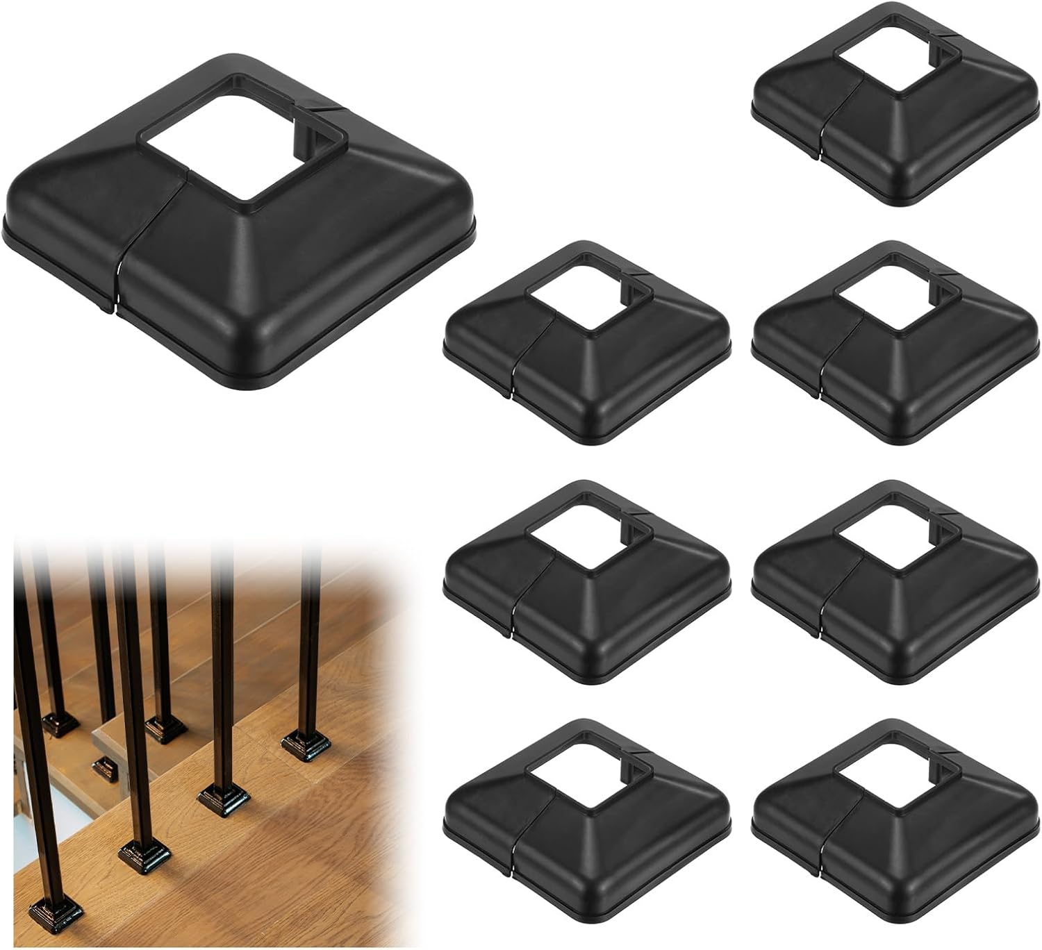 PRODUCT APPLICATIONThe post base bracket is perfect for many places that need wood posts. It is widely used, and very suitable for stair handrails, corridor posts, fences, and many other posts. Suitable for trim, matches well with the surroundings, and looks more elegant and simple.PRODUCT DETAILS & INCLUDE√ Color: Black√ Shape: Square√ Material: Plastic√ Outer Dimensions: 72x72x20mm/2.8"x2.8"x0.78" (L x W x H)√ Internal Dimensions: 25x25x20mm/1"x1"x0.78" (L x W x H)√ Package includes: 8pcs x Deck Post Base CoverPRODUCT FEATUREThe Deck Post Base Cover features a unique split design and easily covers exposed post or construction defects without pulling out the railing, giving your deck railings, handrails, stairs, and porches a new, organized look.INSTALLATIONThe split type post skirt is easy to install without needing to remove the rails; With a snap-together design, all you'll need to do is ensure the ends are firmly fixed and won't move; This design saves time and effort while ensuring tight-fitting coverage.