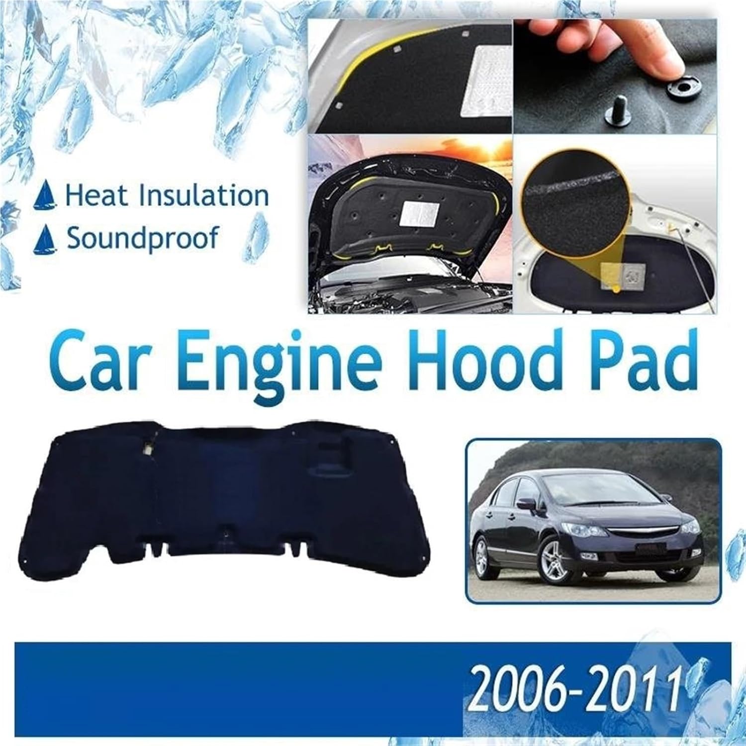 Product Only Fits For Civic 8th Gen 2006 2007 2008 2009 2010 2011Note: The sound insulation mat needs to be folded for transportation so there will be some creases on the surface.Tip: Leaving it in the sun can effectively eliminate creases.Functions:1. Heat and sound insulation.2. Maintain engine compartment temperature and protect the engine.3. Reduce the aging and deformation of parts and pipelines in the engine compartment.4. Good durability and reliability.Specifications:Item Name: Front Engine Hood Sound Heat Insulation Cotton PadMaterial: PET CottonPosition: Front, CenterAccessory type: Comes with fixing clip, direct replacement