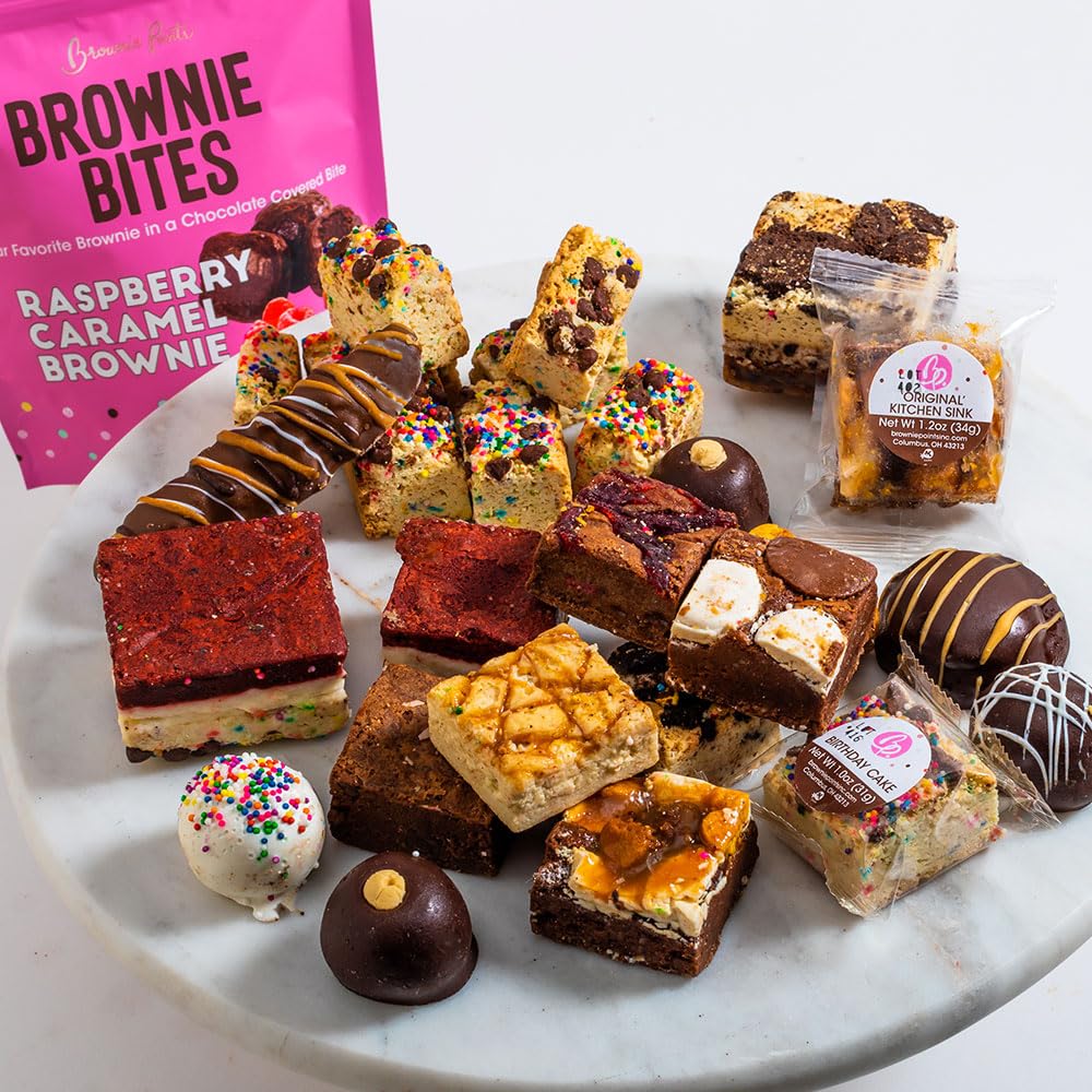 "Every Batch Baked from Scratch: Baking is the ultimate love language. Fresh-from-the-oven comfort, our Brownies and Confections are baked in small batches, Indulge in the ultimate chocolatey delight with our Brownie Points Brownies! We use the finest and freshest real ingredients (real eggs, real butter, and sustainably sourced real chocolate). Brownie Points Brownies are a Perfectly-sized masterpiece. Every Brownie is individually wrapped for ultimate freshness and peak shareability. They arrive fresh and are perfect at room temperature for 5 to 6 days and up to 6 months when tucked away in your freezer. Perfect for sharing, stashing or as on-the-go individual snacks. Whether you're treating yourself or surprising someone special, our Gourmet Sweet Desserts are sure to earn you some serious Brownie Points! Every Brownie Points gift is created to order, presented in a gift box and hand-tied with a ribbon. Our gift boxes are 100% biodegradable and produced in Ohio (just like our Brownies). Your gift containing individually wrapped brownies includes a selection of our best-selling flavors, including Original Kitchen Sink, Red Velvet, Salty Caramel, and a delightful selection from our two dozen unique flavors. Don't miss out on this opportunity to elevate your dessert experience to a whole new level."