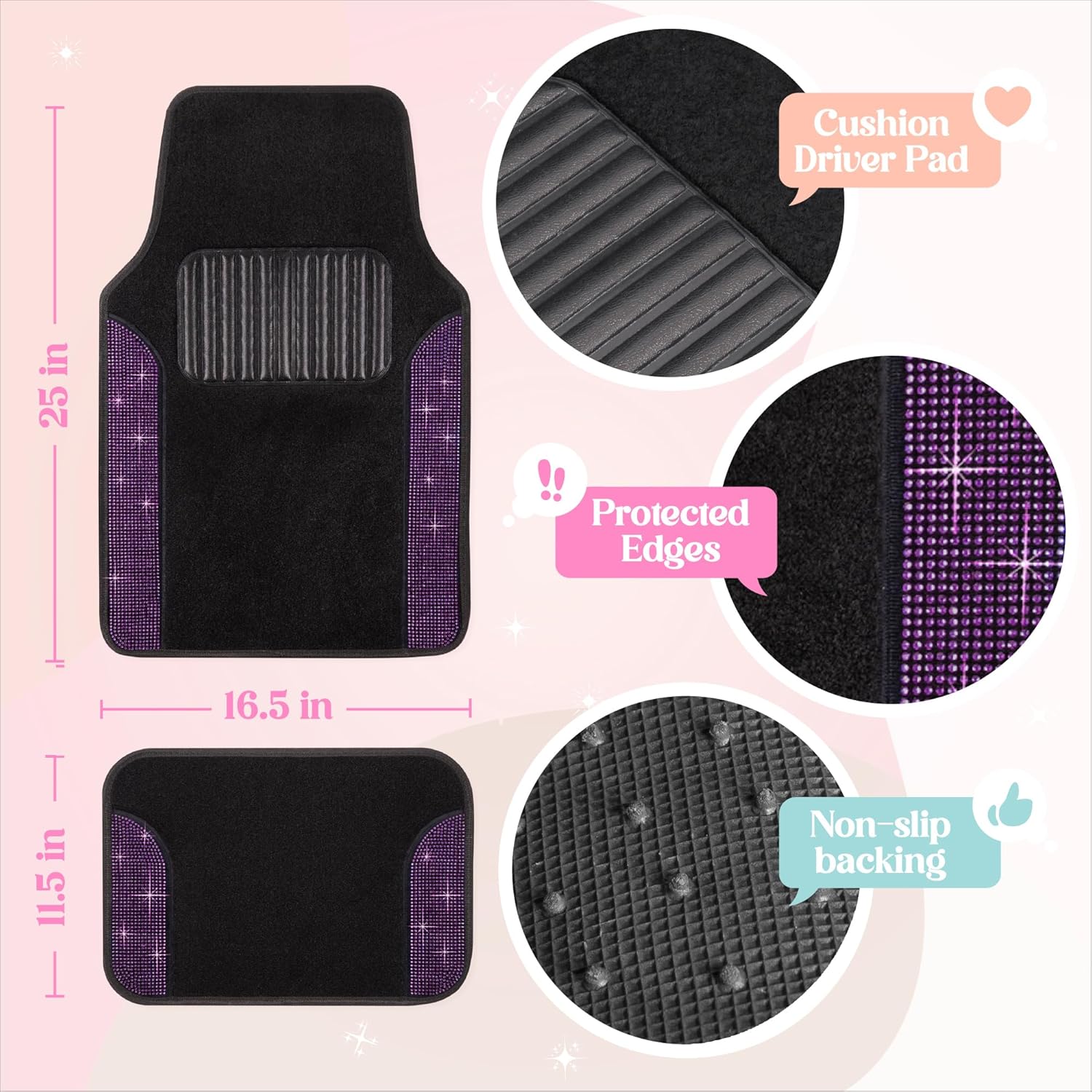 Carbella Diamond Bling Car MatsThe Carbella Diamond Bling Car Mats 4-Piece Set is the ultimate automotive accessory for women and girls who want to add a touch of glamour and elegance to their car, SUV, or van. Featuring a stunning two-tone purple design with sparkling rhinestone crystals, these carpet floor mats transform your vehicle’s interior into a dazzling, stylish space. Crafted from high-quality, durable materials, they offer long-lasting protection against dirt, spills, and wear, ensuring your car’s flooring remains pristine.With a universal fit, these mats are compatible with most vehicle models and are easy to install, seamlessly blending into your car’s interior. The thick, plush carpet provides a comfortable and luxurious feel, while the textured surface and heel pad enhance safety by offering excellent grip to prevent slippage. Maintenance is a breeze—simply shake off dirt or give them a quick wipe or vacuum to keep them looking fresh and vibrant. Perfect for those who love cute and functional car accessories, the Carbella Diamond Bling Car Mats combine sparkling style with reliable performance, making every drive a glamorous experience.A few examples of car or truck make and models these floor mats will fit include: Ford (Explorer, F150, Ranger, Escape, Expedition, Fusion, Lightning Mustang), Toyota (Tacoma, Rav4, Highlander, Prius, Tundra, Camry, Corolla), Chevrolet (Silverado, Chevy Colorado, Traverse) Dodge (Ram, Charger, Challenger), Honda (Civic, Accord, CR-V, Pilot, Odyssey, HR-V), Hyundai Elantra, Nissan Altima, Jeep Grand Cherokee, Kia K5, BMW, Mercedes, Lexus & more!