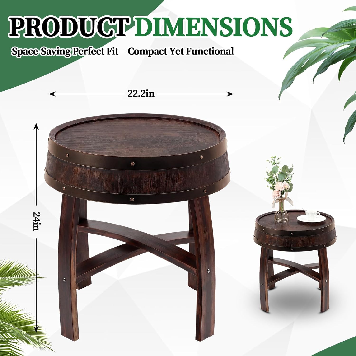 Features: Crafted from solid oak with a circular whiskey barrel design, this table brings rustic charm and versatile functionality to any space. Its hand-built construction ensures durability and unique character, making it ideal for use as a coffee table, side table, or decorative accent. Nice for farmhouse, vintage, or industrial decor styles, this table complements living rooms, bedrooms, patios, and more. The natural wood grain and authentic finish enhance its aesthetic appeal while providing a sturdy surface for daily use. Specifications: Material: oak Color: walnut wood color Size: 22.2" D x 24" H Package includes: 1 x Whiskey Barrel Side Table Notes: Manual measurement, please allow slight errors on size. The color may exist a slight difference due to different screen displays
