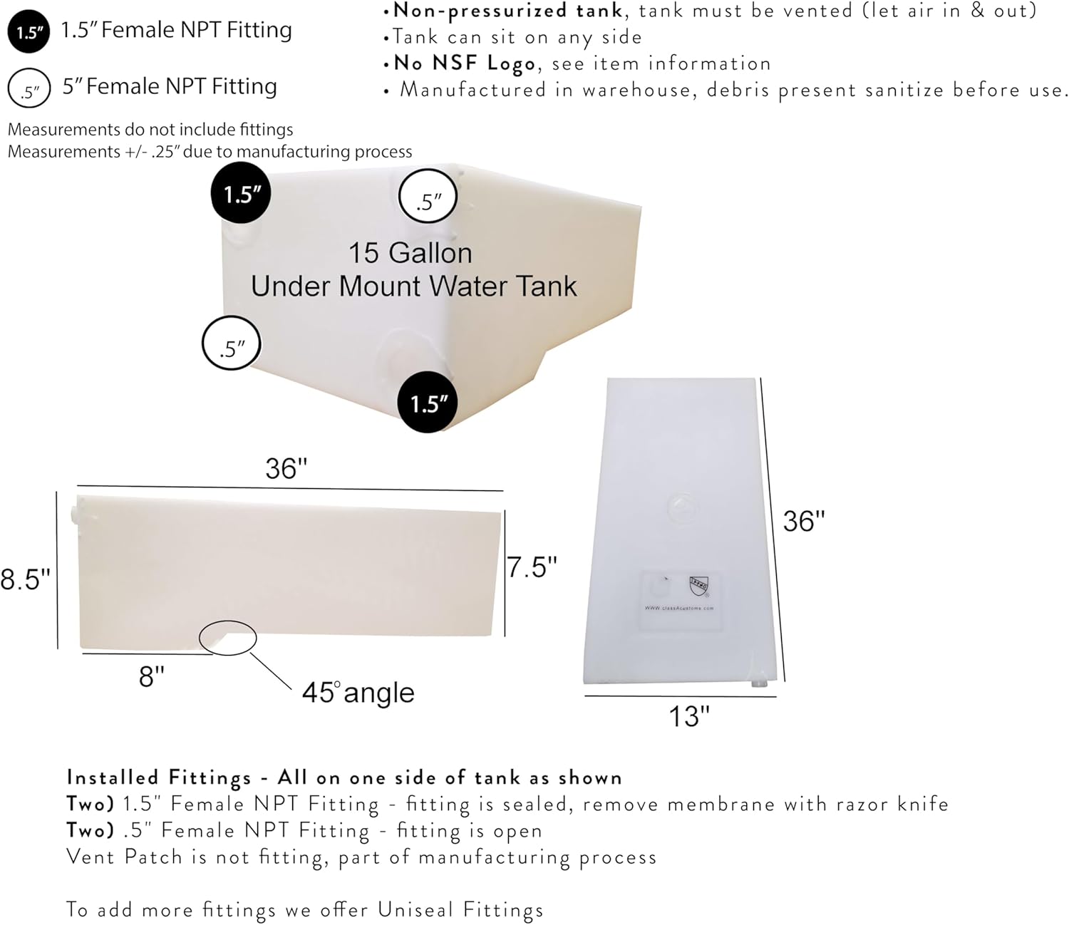 • TANK BUILT-IN FITTINGS: (TWO) 1.5" Female NPT Fitting - fitting is sealed and watertight, to use remove membrane with razor knife (TWO) .5" Female NPT Fitting - fitting is open DO NOT over-tighten fitting damage will occur, use plastic connecting fittings as metal will damage threads.