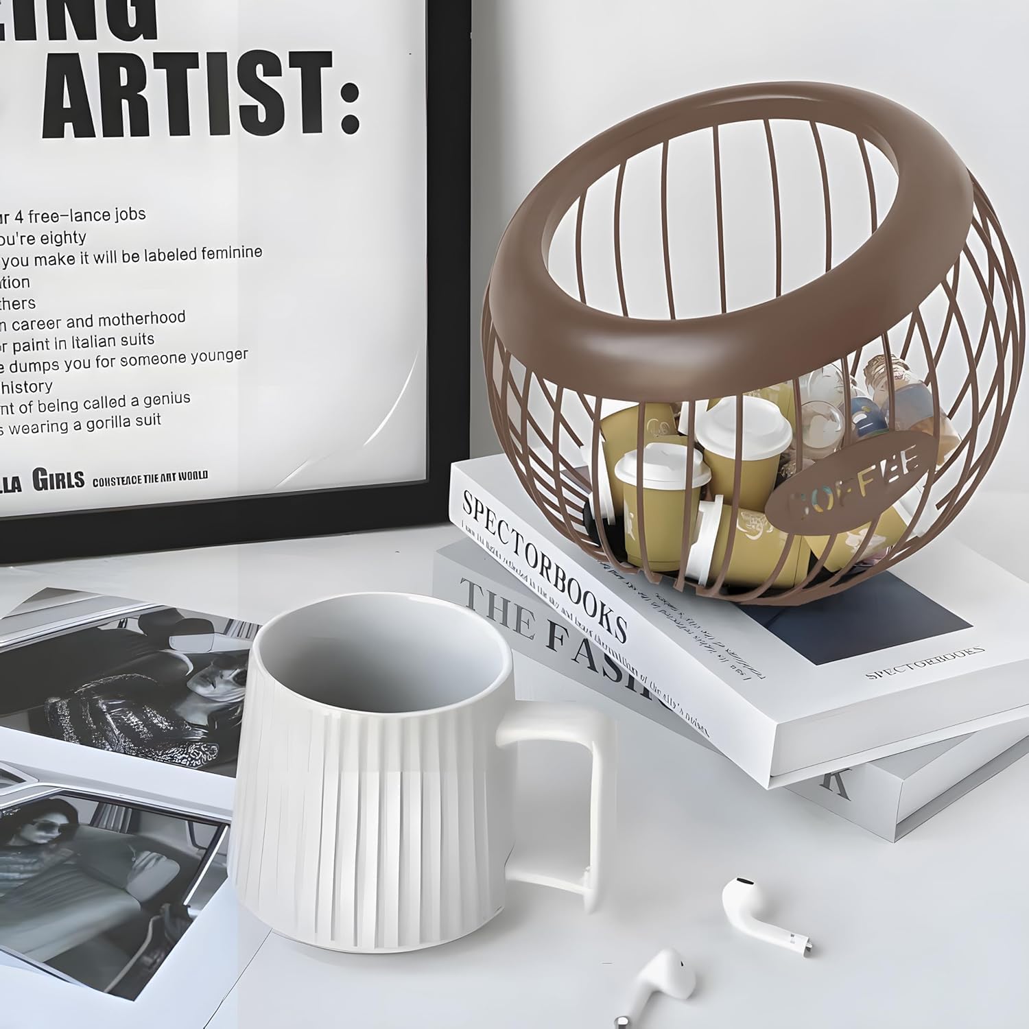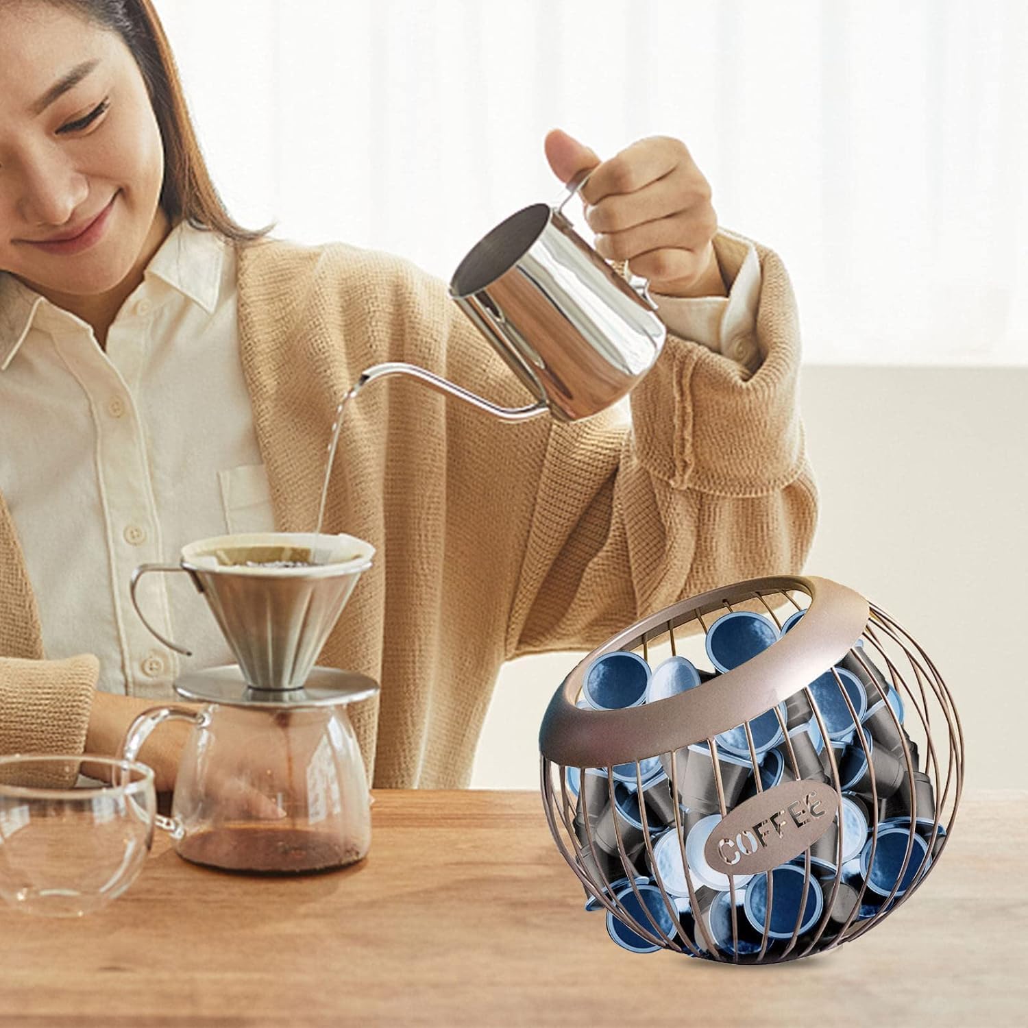 Easy to AccessThis coffee capsule storage basket is designed with wide mouth, that the opening is big enough, it is very convenient for you to grab out pods and also easier to refill it. It is useful alternative to the K-cup drawer type storage, easy your life.Great Counter OrganizerThe nest-inspired shaped K cup holder are very stylish and functional, it is great organization for your coffee bar, keep your coffee pods safe, and your counter neat.Great DecorThe metal coffee station organizer with coffee sign perfectly matches with any kitchen, coffee bar, Living room, it is a great addition to your kitchen counter, very handy and ideal for placing the coffee capsule next to the machine.Well MadeOur coffee pods organizer is well made of premium metal, which is very sturdy, lightweight, smooth, aesthetic, last a long time, and the flat base can keep your basket stably. It is a must have item in your coffee station.