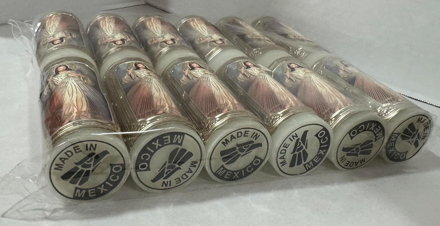 Illuminate your sacred space with these exquisite Divine Mercy Paschal candles. Each set includes 12 beautifully embossed mini candles, crafted from premium beeswax with intricate religious imagery. The candles measure 3.5 inches in height and 1.5 inches in width, making them perfect for personal devotion, Easter celebrations, and Lenten observances. The delicate ivory color and detailed embossing showcase the Divine Mercy image in stunning detail, while the high-quality beeswax provides a clean, steady burn. Made by Cannan these candles are ideal for creating a reverent atmosphere during prayer time or special religious occasions. Each candle in this set of 12 is individually crafted with attention to detail, making them suitable for both personal use and as meaningful religious gifts. These devotional candles serve as powerful symbols of faith and are particularly appropriate for use during the Easter season and Divine Mercy celebrations.