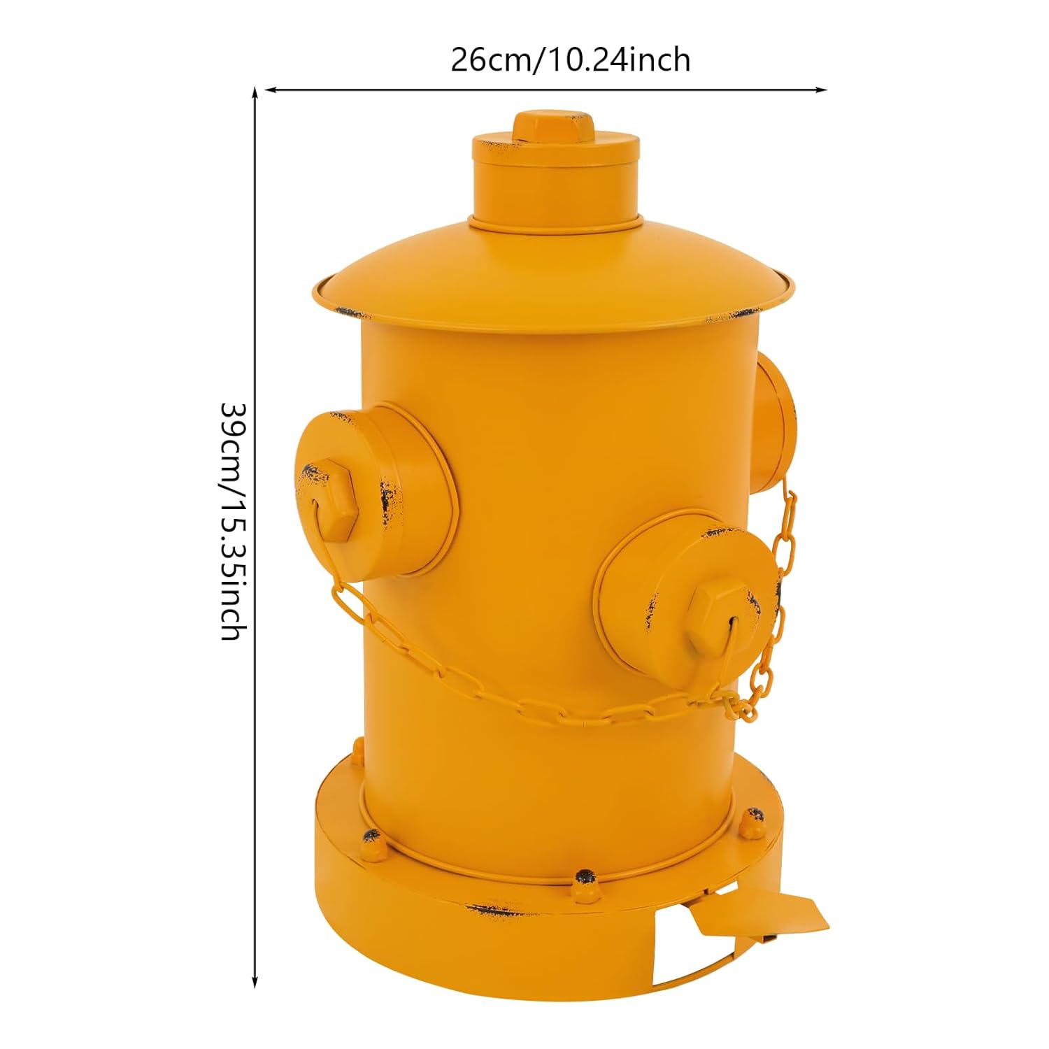 DetailsRound Edges: Smooth and round edges are comfortable to touch and care for your skin.Removable Inner Bucket: It includes a removable inner bucket with a handle, which is easy for removal and emptying of trash for easy portability.ApplicationIt can be used in kitchens, bedrooms, bathrooms, offices, craft rooms, cafes, hotels, bars, and other indoor places, as well as in outdoor environments such as gardens, parks, backyards, and patios.SpecificationColor: YellowStyle: RetroShape: CylindricalMaterial: IronAssembly Required: NoProcess: Welding, Spray PaintingMounting Type: FreestandingOpening Mechanism: Step-OnCapacity: 2.5L/0.66GalProduct Size(D*H): 26*39cm/10.24*15.35inPackage Size: 41*32*32cm/16.14*12.6*12.6inGross Weight: 2.8kg/6.17 lbsNet Weight: 2.66kg/5.86 lbsPackage Included1* Retro Garbage CanNotes1. Please pay attention that the appearance is made in retro style, so there are mottled and old traces visually, which is a normal appearance and does not affect normal use.2. Due to technological reasons, some products may inevitably have minor defects, and please make sure that you do not mind before purchasing.