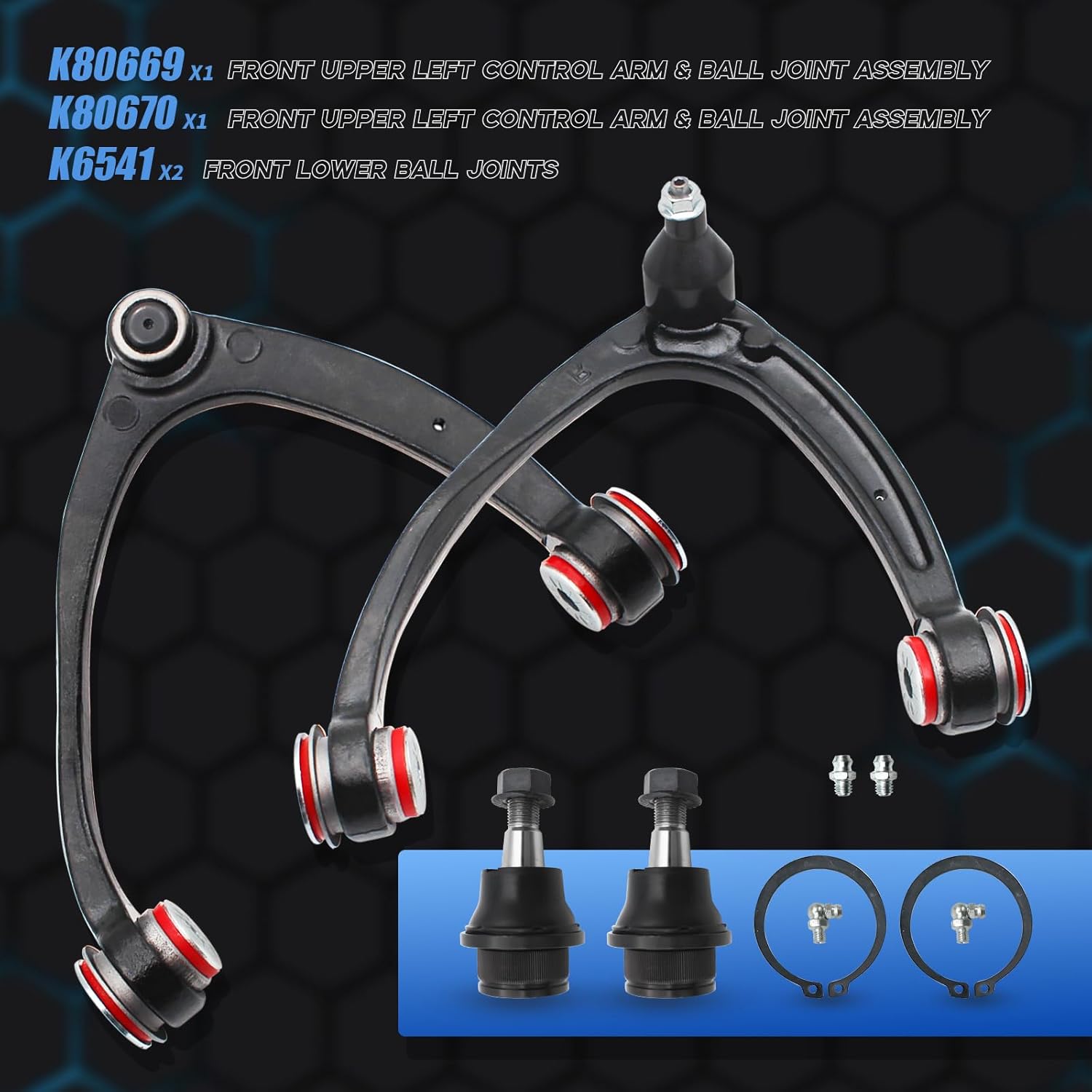 | Included Components | 2 x Front Upper Left Control Arm & Ball Joint Assembly - K80669 K80670, 2x Front Driver and Passenger Outer Tie Rod Ends - ES800223, 2x Front Driver and Passenger Side Inner Tie Rod Ends - EV800084, 2x Front Lower Ball Joints - K6541, 2x Front Stabilizer Sway Bar End Link Driver and Passenger Side - K700432PU |