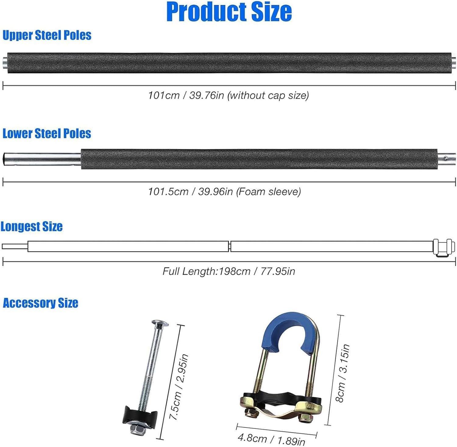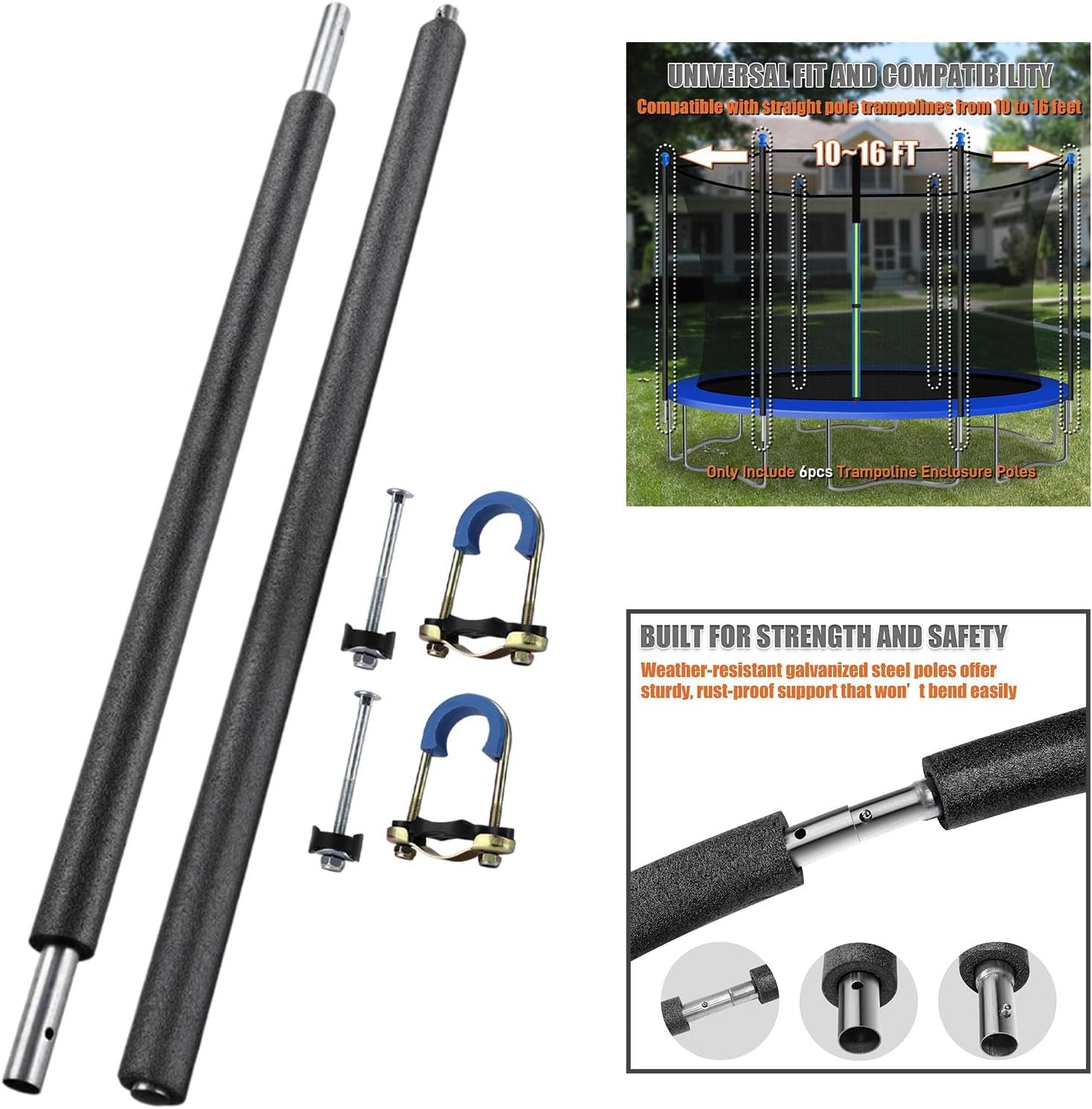 Description: - 【Universal Compatibility】: Designed to fit trampolines ranging from 8 feet, this replacement pole set is round frame trampolines and is specifically crafted for top enclosure systems, making it an ideal choice for replacing damaged or aging net poles - 【Complete Hardware Set】: Each set includes all necessary hardware components, including two section trampoline poles, mounting brackets, and a pole cap. The convenient two pieces design installation on any trampoline - 【Enhanced Durability】: Featu reinforced upper and lower pole set, each package includes 1 upper pole and 1 lower pole made from high strength metal material. This provides great stability and effectively extends the lifespan of the enclosure - 【Security Foam Protection】: Every pole is equipped with a high density foam sleeve that is soft yet impact resistant, significantly reducing the risk of injury from collisions while children play near the edge of the trampoline - 【Easy Installation】: The user friendly design allows for quick assembly without hassle, that your trampoline's security enclosure can be efficiently so you can and security for your familySpecification: - Material: GalvanizedSize Chart:Straight Pole: Upper Pole Length: 101cm/39.76inch, Lower Pole Length: 101.5cm/39.96inch, Overall Length: 198cm/77.95inchCurved Pole: Upper Pole Length: 97cm/38.19inch, Lower Pole Length: 105cm/41.34inch, Overall Length: 199cm/78.35inchPackage Includes:1 Upper Pole1 Lower Pole1 ScrewsNote:Please allow slightly errors due to manual measurement and