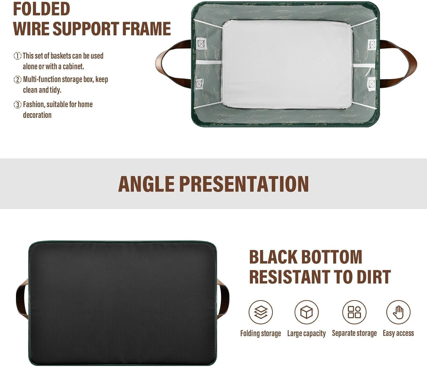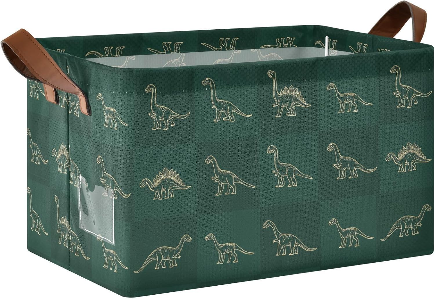 YNNALE storage bins have spacious capacity, measures 16.9(L)" x 11.4(W)" x 10(H)"; this large size enables you to store a wide variety of items to keep your home tidy and organized. YNNALE storage baskets are made of stiff cardboard on the bottom and all sides walls so that the organization bins stand on their own, even when empty; sturdy materials ensure that these storage containers are strong and long-lasting. The leather handles are thick and nice, has great stability and well-constructed.YNNALENavy Green Plaid Dinosaurs Pattern decorative storage bins are designed to fit perfectly on laundry organization and storage, in closets, or under beds, office supplies,maximizing your storage space and keeping your home clutter-free. And this basket organizer is a great option for organizing and storing clothes, shoes, toys, pet products, toiletry storage, laundry clothes, bed sheet, sport gears, magazines & books, CDs, towels; the collapsible storage cubes can be easily stored in closets, drawers, shelves, etc. YNNALE fabric baskets are easy to clean, simply dust with a soft dry cloth. Due to the metal frames, we recommend that you hand wash, do not rinse, do not need to wring, and hang to dry. It is also collapsible for easy storage if not in use, simply fold the basket down flat for space-saving storage when not in use.YNNALE storage basket has different themed patterns and colors, can match your adorable home with different style and it is pretty enough to be used as a decoration. Whether as a housewarming gift this storage bins are most suitable! Great for Birthday days, Mother's Day, Valentine’s Day, Easter, Fourth of July, Memorial Day, Father’s Day, Thanksgiving, Harvest, and Christmas.How to remove the wrinkles:1. open the package, hold up the basket2. stuffed clothes in the basket for few days3. Iron basket with ironing machine