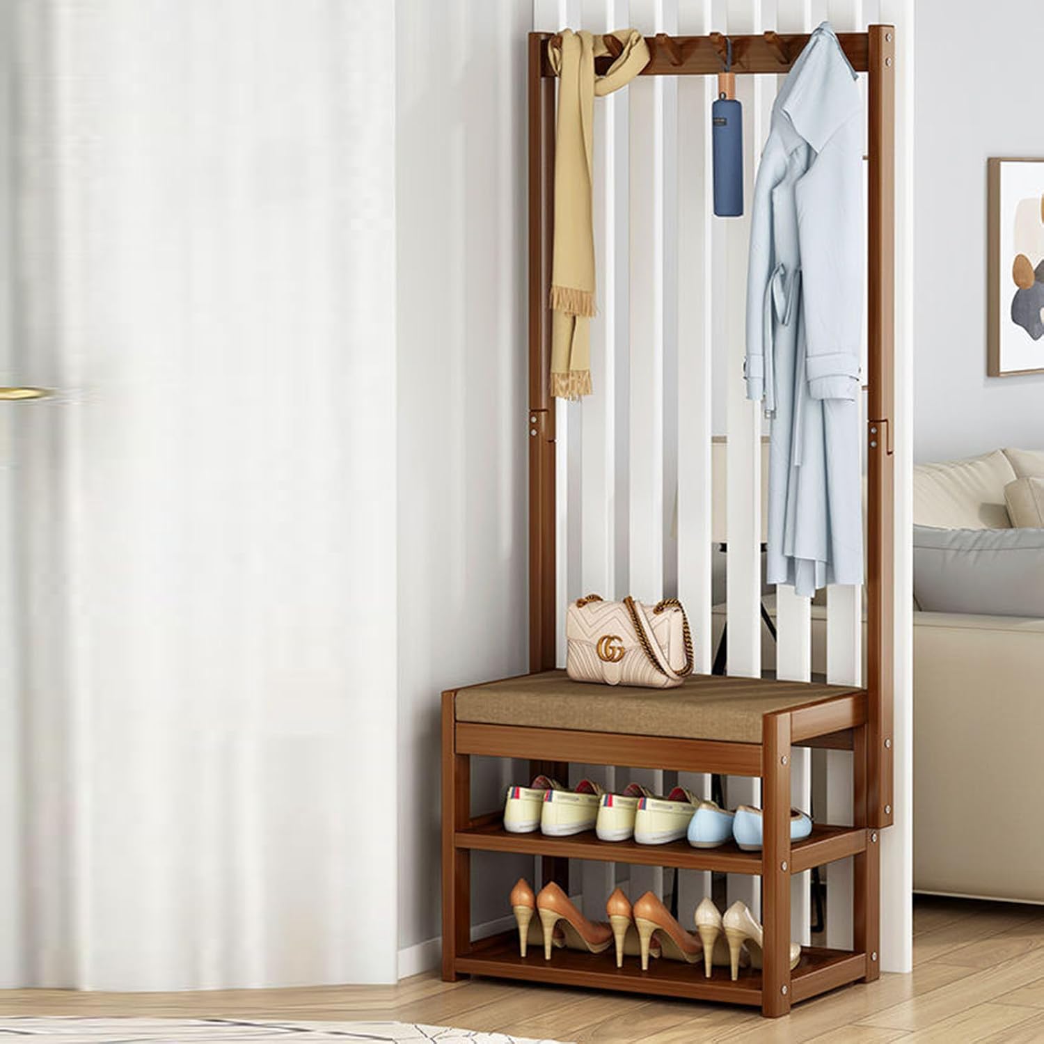 Advantage: 1.This is a great item to place in the entrance hallway so that you can sit down and put on your shoes. You can also hang hangers on it. Very handy. 2.Entryway coat rack shoe bench,3 in 1 design, make the most of your space, easy to fit snugly in a corner to maximize your limited space. 3.Multifunctional shoe bench fits well in the lavatory, hallway, entryway, foyer, bedroom, etc. Overall Size: 50cm L*30cm W*168cm H 60cm L*30cm W*168cm H 70cm L*30cm W*168cm H 80cm L*30cm W*168cm H 100cm L*30cm W*168cm H Height from floor to top: 168cm Features: Top for hanging clothes Soft and comfortable cushioned seat Double bottom storage Carrying capacity: 80kg Solid wood bamboo Packaging. 1 x coat rack Notice 1. Due to the different display screen, the color will be slightly different, this is not a quality problem 2. Since the size is measured manually, there will be an error of 1~2cm, please understand 3. There are many products in our store, For more coat racks of the same style, please search for + coat racks.