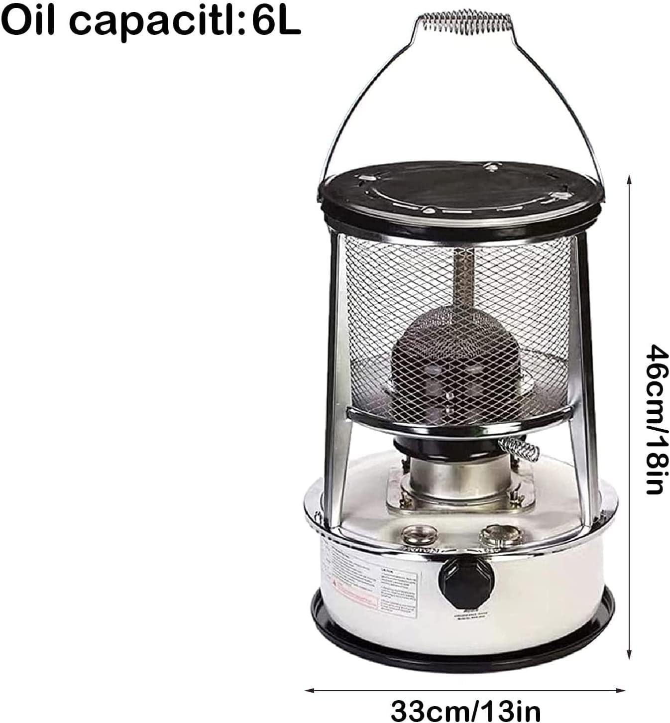 Kerosene Heater,You can use this heater to heat a single room instead of expensive heating for the entire house, thereby protecting the environment and reducing energy costs.Equipped with automatic flameout function when dropped or shaken to improve safety.After a few seconds of lighting, it immediately heats the indoor/outdoor space. It covers an area of about 12 square meters and keeps the whole body warm.Suitable small spaces heating such as living room, bedroom. Perfect for cooking in the kitchen. Also perfect for outdoor camping, barbecue, winter ice fishing, mountaineering, etc.Specification:Product name: Kerosene HeaterColor: WhiteSize: 33x33x46cmNet weight: 4.9kgGross weight: 5.4kgMaterial: Iron+Paint+EnamelFuel tank capacity: 6LOutput heat: 7800~9000 Kcal/HFuel consumption: 0.24~0.28L/HHeating area: 12 Square MetersUse range: Home Office OutdoorDuration: 16 to 21 HFuel: KerosenePacking List:Kerosene Stove Heater *1Stove Bag*1Be careful when using this appliance in enclosed spaces such as campers, tents, cars, or homes. Maintain ventilation and use a carbon monoxide detector.Kerosene Heater,