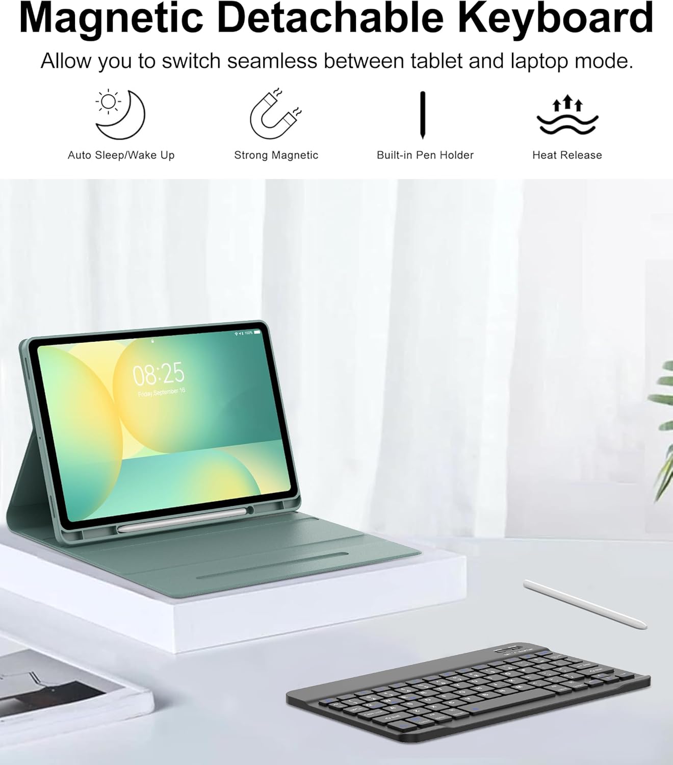 | Additional Features | Adjustable Viewing Angles, Built-in Pen Holder, Detachable Bluetooth Keyboard, Hotkeys and Media Keys, Portable and Lightweight |