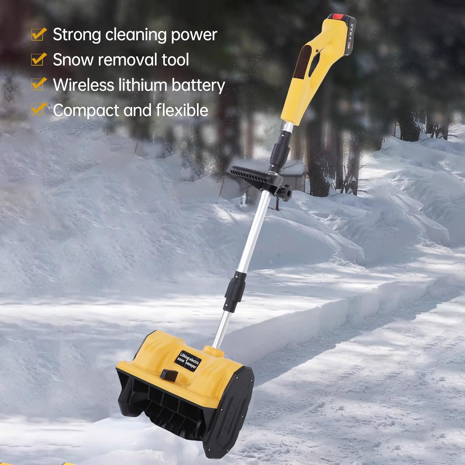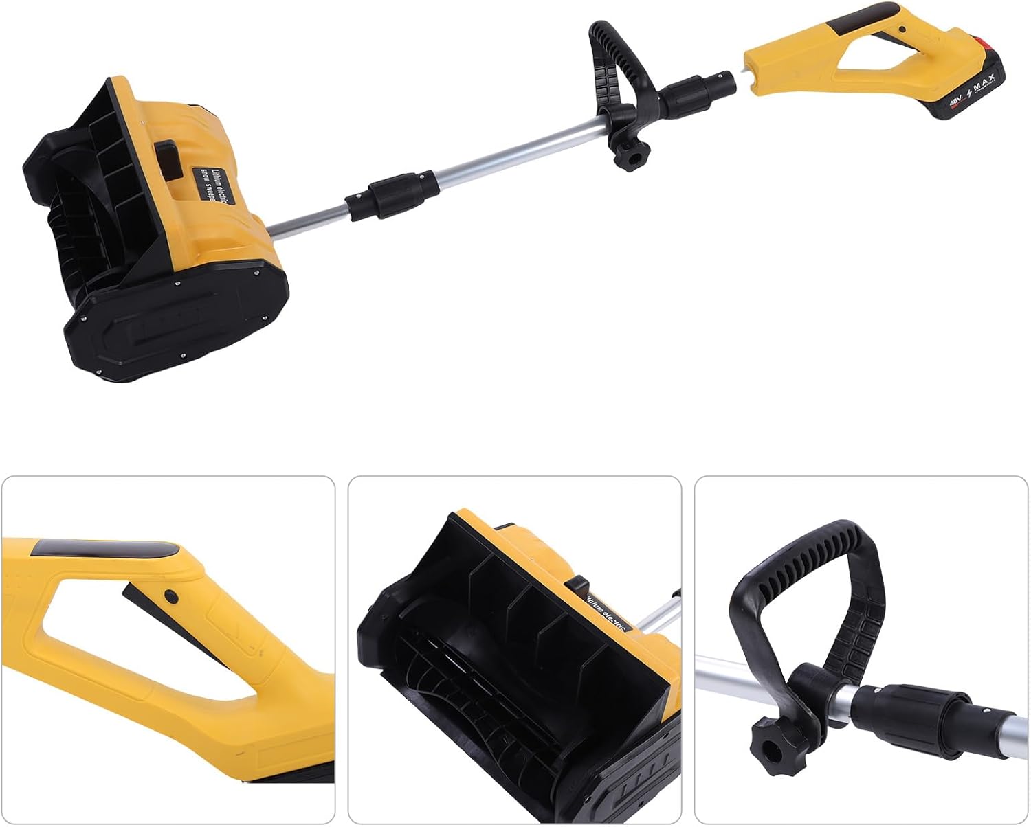 [Efficient Snow Removal] Double-> spiral drill efficiently collects snow within the cleaning width range, with a clearance width of 28cm. [Rechargeable Battery] Equipped with rechargeable battery for convenient outdoor operation, ensuring no cord restrictions. [Easy Storage] Foldable snow pusher for easy storage, with a flexible protective net wrapped around the power cord to avoid damage during storage. [Enhanced Control] Auxiliary support handle enhances control, making it easy to push and steer the device with . [Durable Design] Durable dual curve spiral design for effortless snow removal, sturdy withstands cold temperatures for a longer lifespan. Spec: Battery: Rechargeable battery 10 x 1500mAh x 1 (battery included) No load Speed: 0 33000r/min Drum Length: 280mm No load Current: 5A Load Current: 25 50A Power: 500W Snow Intake Height: 16cm Throwing Distance: 8m Package List: 1 x Snow Blower 1 x Battery 1 x Charger 1 x User Manual 1 x Auxiliary Handle How To Use: Follow the instructions in the manual