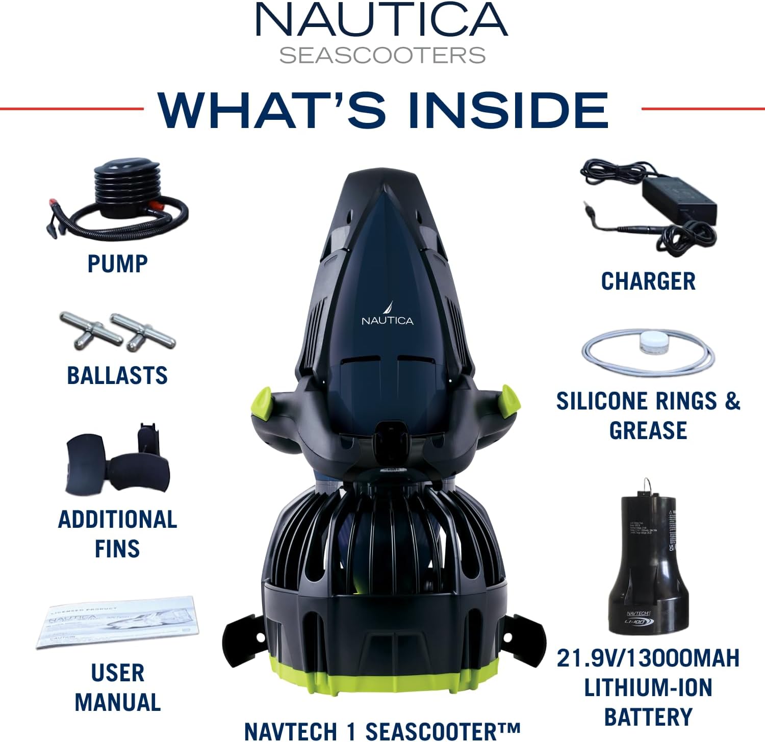 The NavTech 1 Seascooter by NauticaThe NavTech 1 Seascooter is an exceptional device for underwater exploration.Its advanced features and innovative design provide unparalleled maneuverability and control, allowing divers to effortlessly explore even the most challenging underwater environments.With a sleek and streamlined design that minimizes drag and ensures maximum speed, the Seascooter is perfect for adventurous underwater expeditions.Both professional and recreational divers will find the NavTech 1 Seascooter to be an excellent companion for their next underwater journey, offering ease and confidence in exploring the ocean depths.