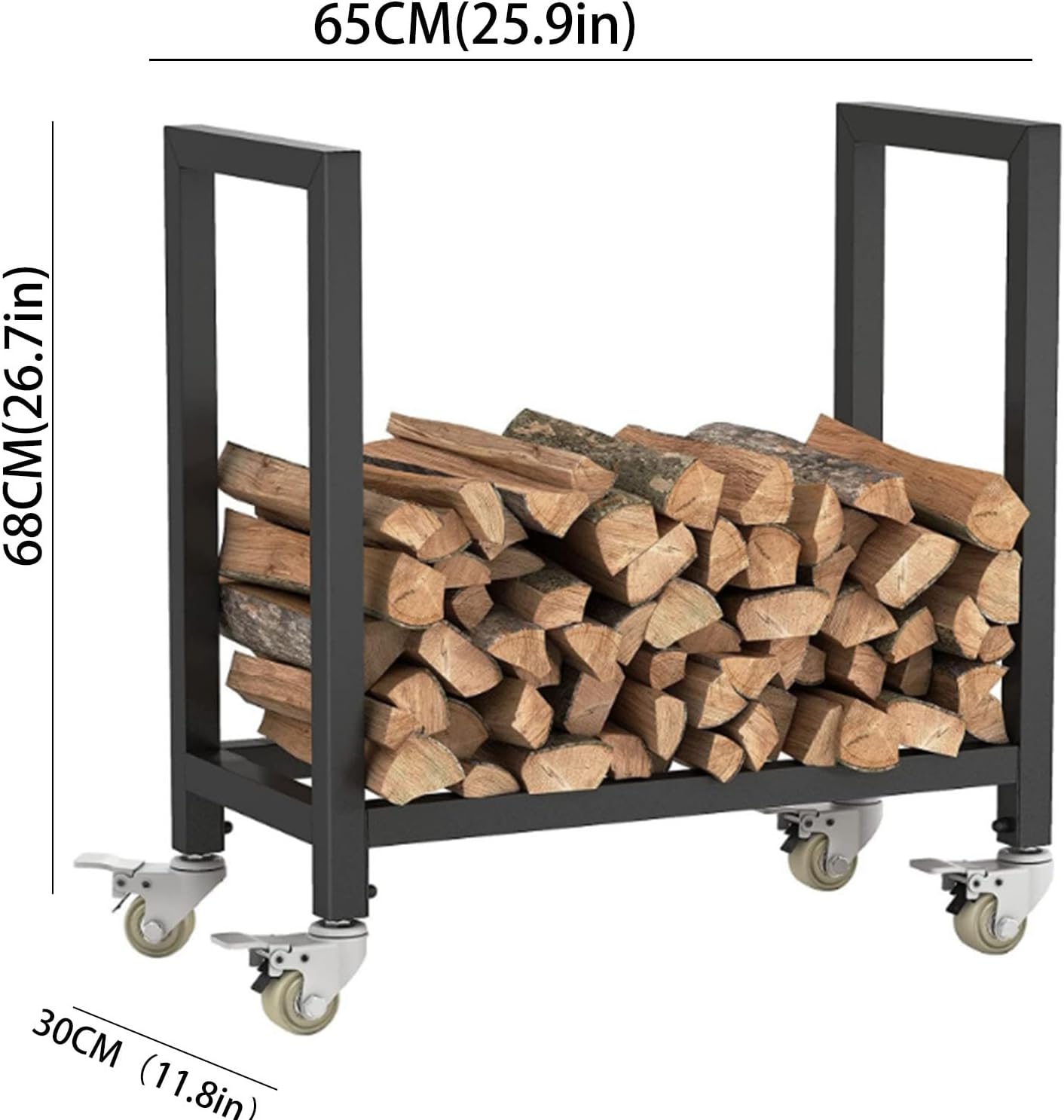 Easy To Assemble Wrought Iron Firewood Storage Rack Features: 4 casters with locking function, you can easily move and fix the hanger to any needed area in your home Simple wood stacking rack for outdoor heavy-duty decoration and removable fire rack Wide base Reinforced and widened base improves stability feature: Installation method: Floor type Colour: Black Size: 65*30*68CM (25.5*11.8*26.7in) packing list: 1x Match Holder