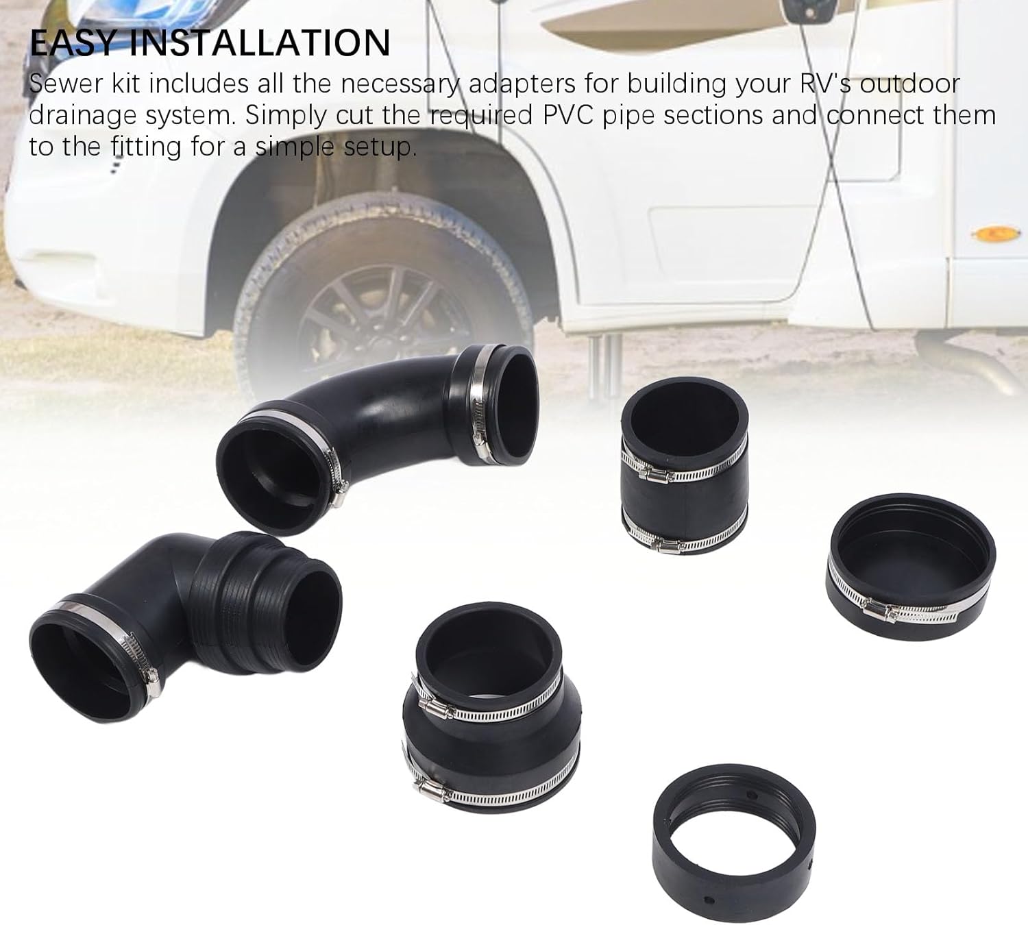 Item Type: RV Sewer Hose Connection KitMaterial: RubberFitment: for RV TrailerPackage List:1 x Waste Water Pipe Kit (6 Components)1 x Storage Box