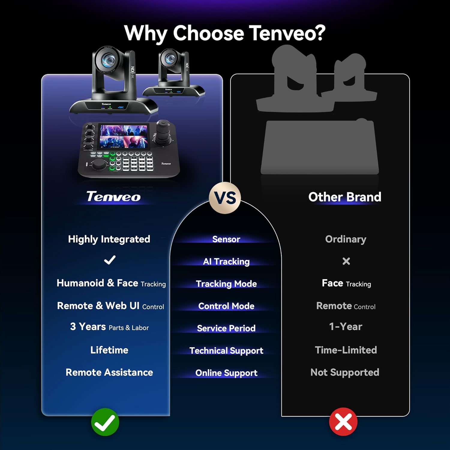 | Features | 20X Optical Zoom, Advanced AI Humanoid & Face Auto Tracking, HDMI/LAN/NDI/USB3.0 Multiple Connections, PoE Support, Universal Compatibility, 24/7 After-sales email: tenveo_amazon@tenveo.com, 7’’ LCD Quad-Screen Real-time Preview, 4D Joystick Operation, Easy PTZ Control, Multi-Cameras Precision Control, NDI/VISCA/VISCA over IP/PELCO-P/PELCO-D Protocols, Turn AI Tracking On/Off, Tracking Recording & Playback, IP Auto Search, Professional-Grade Live Streaming Capabilities, Enterprise-Grade Connectivity & Control, Optimized for Worship & Collaborative Spaces, Tenveo 20X 4K NDI AI Tracking PTZ Camera(2pcs) + NDI Joystick Controller Bundle/Kit |