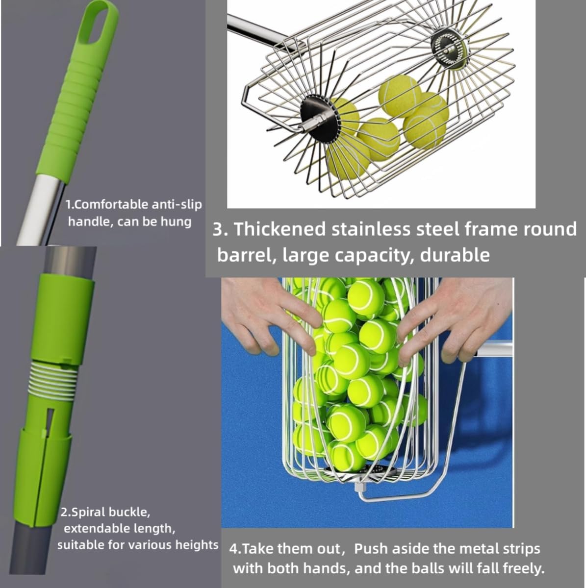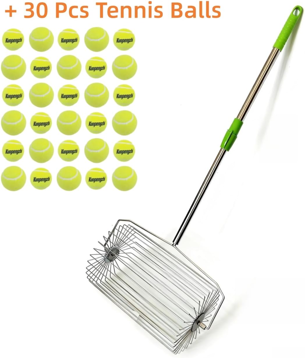 [Stainless Material ] Crafted from stainless steel, this ball retriever is built to withstand rigorous regular use. Its rust and corrosion-resistant properties, combined with excellent elastic recovery, ensure minimal deformation and reliable performance in both sunny and damp conditions. 【 Applicable Population] The telescopic handle adjusts effortlessly from 46 cm (approximately 18 inches) to 82 cm (32 inches), accommodating users of all heights—from children to adults—with a comfortable grip. With a maximum capacity of 0.7 cubic feet, it can hold up to 36 pickle balls or 60 tennis balls. 【 Ease of Use 】 Light weight and easily disassembled for transport, this ball retriever fits conveniently in a car trunk or court-side locker, making it an essential companion for coaches and players alike. [Multi-scenario adaptation ] Designed to glide smoothly on hard courts, clay, and even grass, it is ideal for tennis and equally effective for collecting pickleballs and other similarly sized sports balls. [ Easy to operate ] Say goodbye to the hassle of bending over. Simply roll the retriever to collect balls in seconds, reducing downtime and maximizing practice efficiency—even more effective when used with a golf cart. It has changed the rules of the game. It is very easy to assemble, and the construction feels both light and durable. Interestingly, when it's empty, it's a little trickier to get balls in quickly, but it's not a big deal, and it actually gets easier as it fills up.
