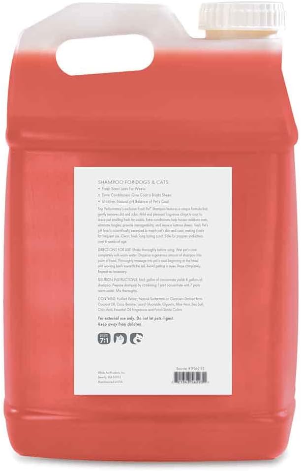 Top Performance Fresh Pet Shampoo is easy to use and smells great...and the clean scent lasts for weeks!• Gives coat a bright sheen • Helps prevent mats and tangles, for easier comb-outs • Formulated to match the natural pH-balance of pets’ coat and skin • Gallon and larger sizes dilute 7:1Safe for puppies and kittens over 6 weeks old. Available in four sizes: 17 ounces, 1 gallon, 2½ gallons, and 5 gallonsIngredients: Tea lauryl sulfate, glycerin, citric acid, and fresh scent fragrance in a mild shampoo base