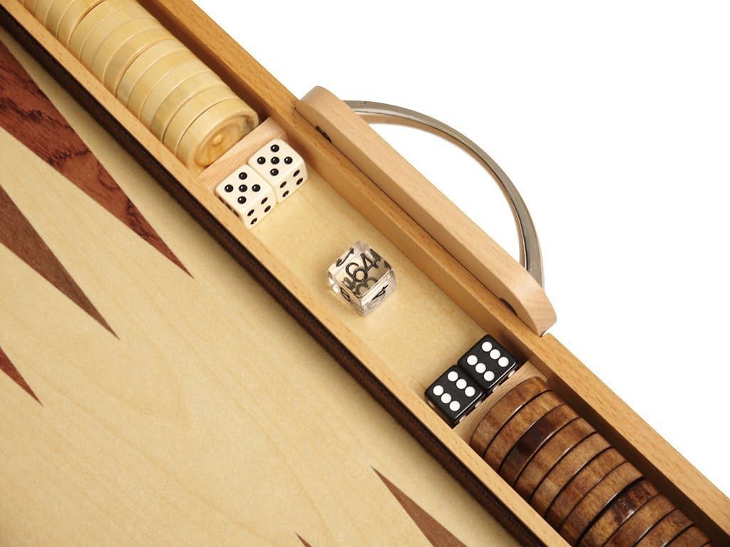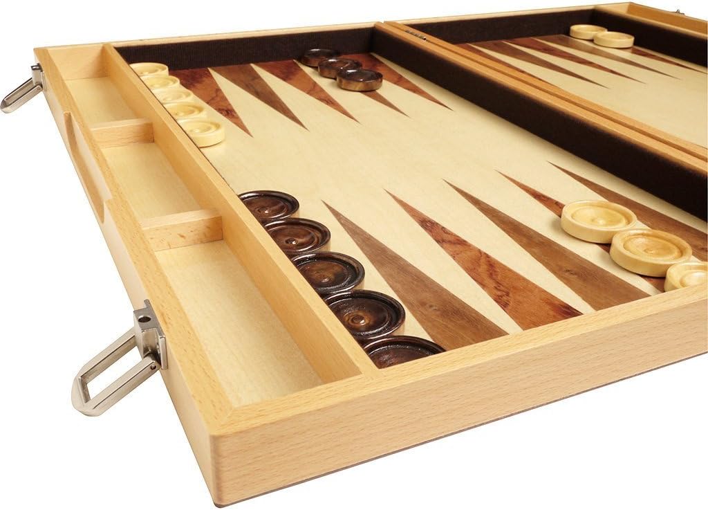 Nothing compares to the old world charm of a wood backgammon set. This large backgammon set features a lovely olive wood exterior, a beechwood playing surface, all-wood checkers and cups as well as polished latches and handle. This backgammon set is perfect for players wanting a wood backgammon set that combines quality and style in a full size board. Additional Product Description Closed Length: 18", Width: 11 1/4", Height: 2 1/4"; Open Length: 18", Width: 22 1/2", Height: 1 1/8"
