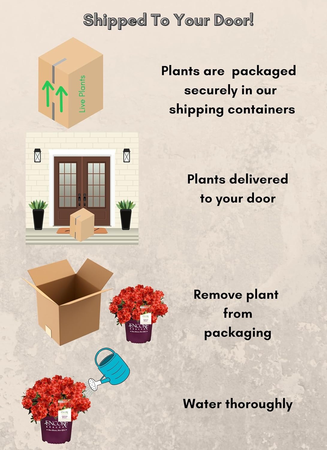 | Product Care Instructions | Turn the soil well and dig a hole twice as wide as it is deep. Mix some organic material with some soil. Put a little bit of this mixture into the hole. Remove the azalea from its container and loosen the root ball lightly with your fingers. Set the plant into your prepared hole, making sure the top of the root ball is slightly above soil level. Make sure the root ball is moist. Pull the soil around the plant, water thoroughly and cover with mulch |