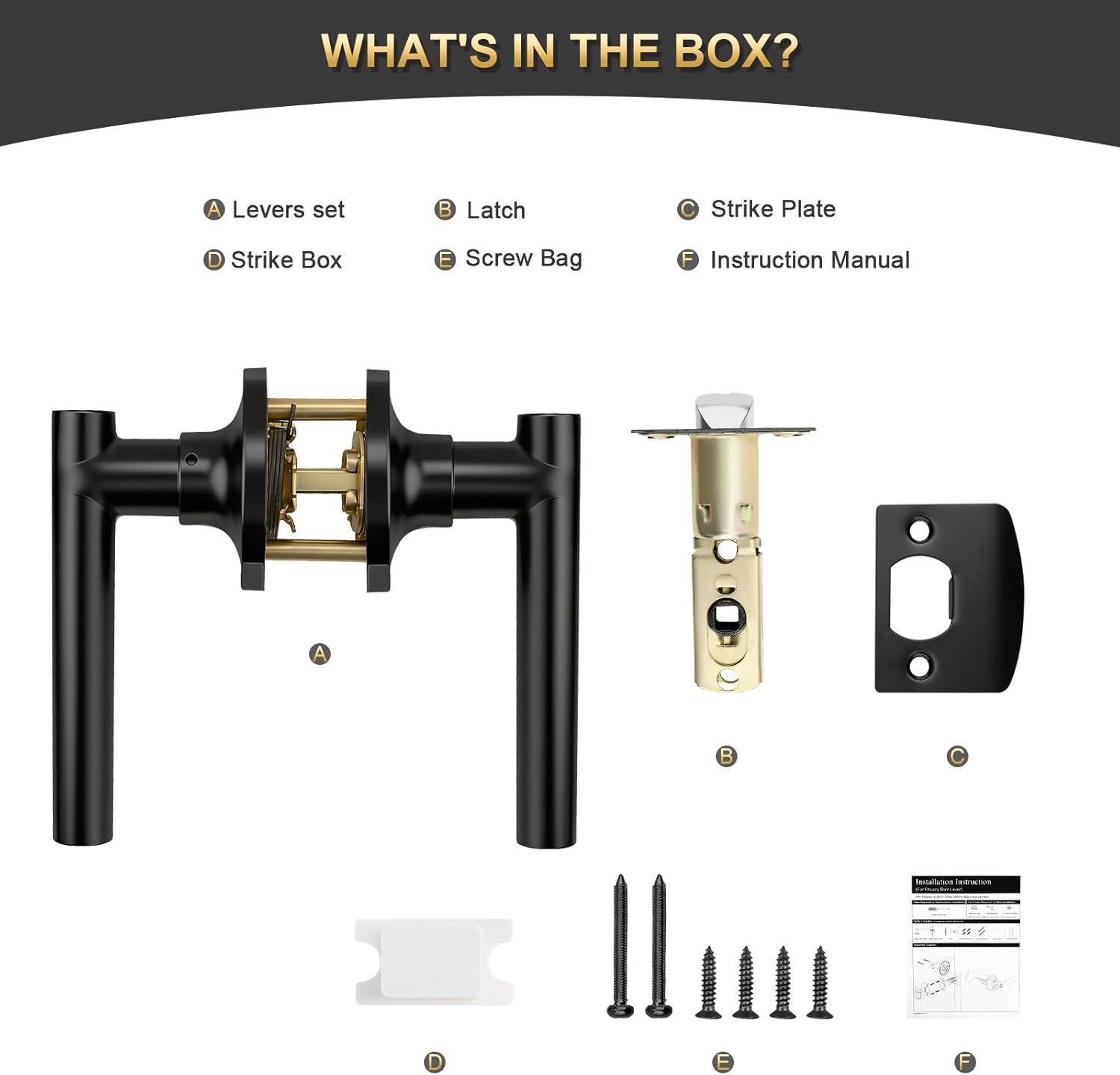 Enhance the functionality and style of your doors with our No Lock Passage Door Lever. This versatile lever handle is designed for non-locking applications, offering convenience and accessibility while maintaining privacy in areas like hallways, meeting rooms, and other non-security sensitive spaces.Upgrade your interior doors with our No Lock Passage Door Lever—a stylish, functional, and easy-to-install solution that brings convenience and sophistication to any space.Built to Last, Beautifully Designed: Crafted from top-grade materials, our privacy door knobs interior are built for durability and long-lasting performance. With a smooth finish and robust construction, they deliver seamless operation and exceptional reliability. Elevate your space with door handle lock that provide security and sophistication.Reversible lever, these door handle sets are perfect for both right-handed and left-handed doors.Our door levers are designed to fit a variety of door sizes and configurations.Transform your doors effortlessly with our black door handles. Simple installation, all you need is a screwdriver. Designed for quick and hassle-free installation, these round door levers fit standard door prep and come with all necessary hardware. Product information: Color: Flat Black Handing: Left, Right, Universal Backset: Adjustable to 2-3/8" or 2-3/4" Fits Door Thickness: 1-3/8" or 1-3/4" Rosette Diameter: 2.56"(65mm) Easy Install: Simple installation is guaranteed to fit on standard pre-drilled doors.Packge includes: Levers for both sides of the door Latch mechanism Strike plates Mounting screws...