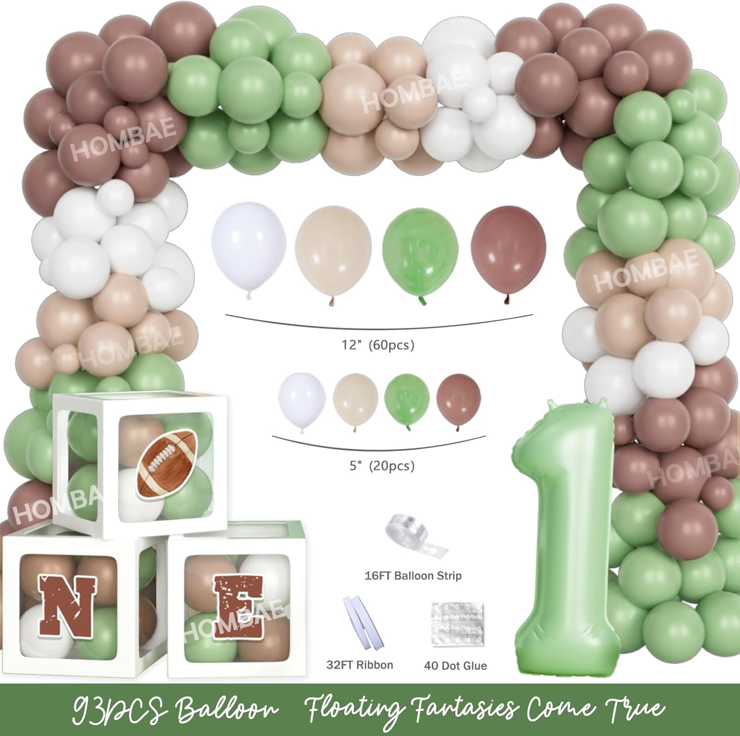 | Included Components | Brown Green Balloon Garland, Boxes, Foil Balloon, Cake Topper, Crown, 1st Milestone Poster, Marker, First Year Down Birthday Party Decorations, Football Backdrop, Photo & Highchair Banner, Poster Stand, Balloon Strip, Glue Dots, Ribbon |