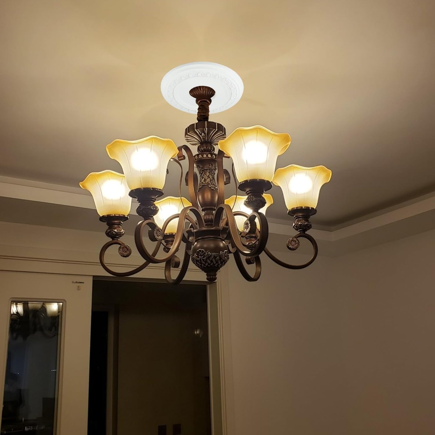 Features:*Sturdy Material:This ceiling medallion is made of PU material, which ensures its durability and longevity. It is waterproof and moisture-proof, making it resistant to aging and deformation.*Versatile Size: With an outside diameter of 30cm, inside diameter of 10cm, and thick-ness of 3cm, this medallion is suitable for most sizes of lamps. It provides a perfect fit and enhances the aesthetics of your ceiling fixtures.*Exquisite Craftsmanship: The medallion features exquisite workmanship, with a smooth item and elegant design. It adds a touch of sophistication and charm to your lamps, creating a visually appealing focal point in any room.*Easy Installation: Installing this ceiling medallion is simple and hassle-free. It comes with all the necessary accessories, and the easy-to-follow instructions make the installation process quick and convenient.*Home Decor:Whether you have ceiling lights, chandeliers, or ceiling fans, this decorative medallion is perfect to elevate and enhance your home decor. It adds a stylish and decorative touch to your light fixtures, transforming the look and feel of any room.Specifications:*Product Name:Light Fixtures Covers Plate*Material:PU*Size:About 30*10*3 cm(Outside diameter*Inside diameter*Thick-ness)*Color:WhitePackage Content:1 * Light Fixtures Covers Plate