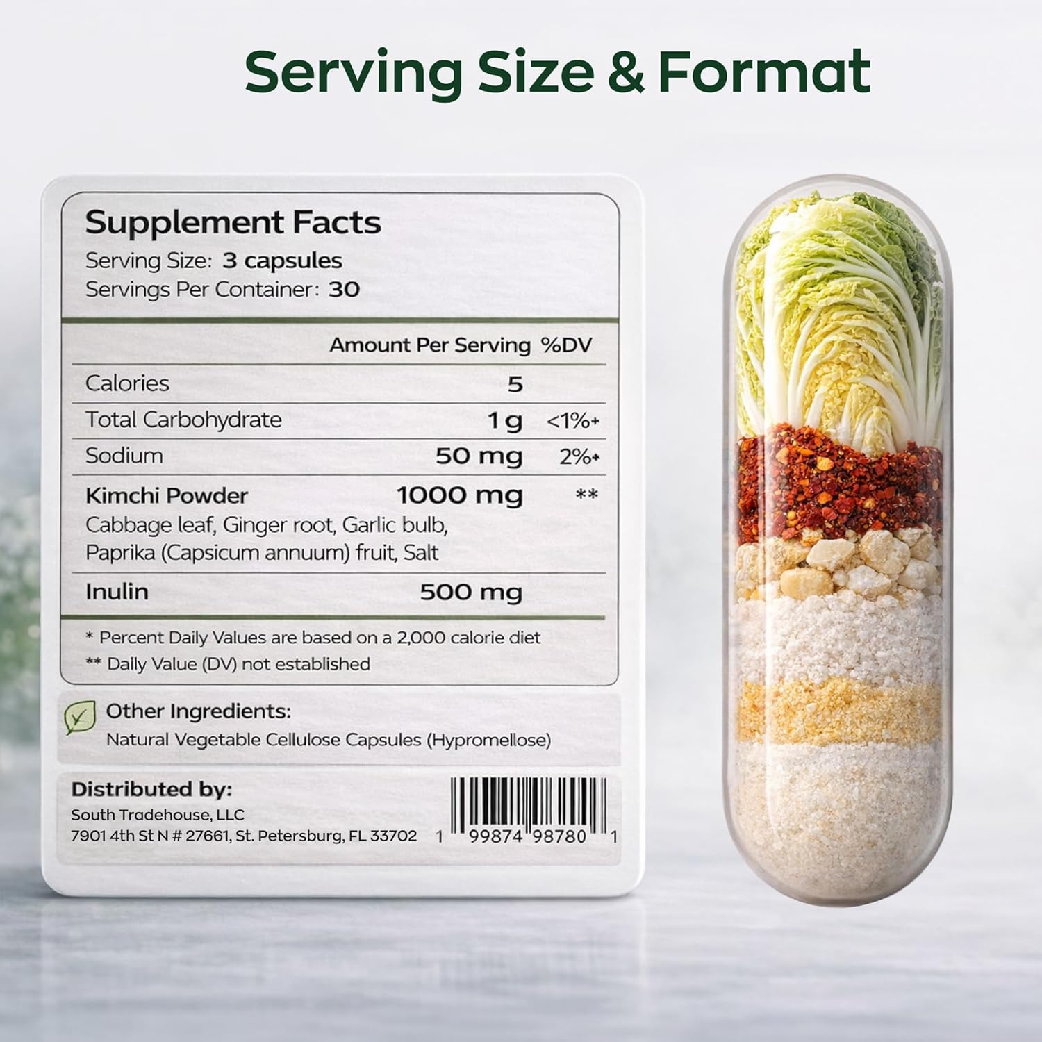 LUNAVA Kimchi Capsules are a fermented superfood supplement made with kimchi powder and inulin for daily gut and digestive wellness. This vegan synbiotic formula combines probiotic and prebiotic support in one simple capsule.Designed for shoppers who want the benefits of kimchi without the strong taste, this supplement fits an easy routine at home, at work, or while traveling. It is a practical choice for people focused on microbiome balance, digestion, and less bloating.Kimchi and inulin work together to support beneficial bacteria and help maintain everyday digestive comfort. The formula is made for consistent daily use as part of a balanced wellness plan for gut health and immune system support.Each bottle includes 90 capsules and is non-GMO, gluten-free, and vegan. The clean format makes these kimchi supplements easy to add to your routine without extra prep.