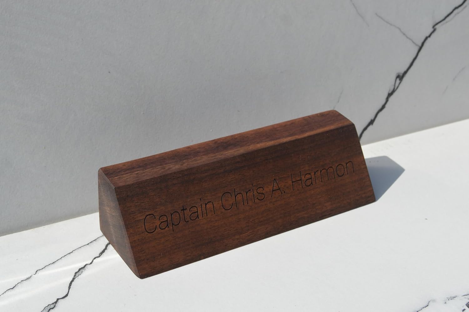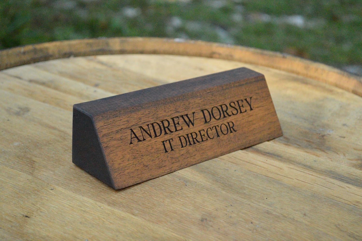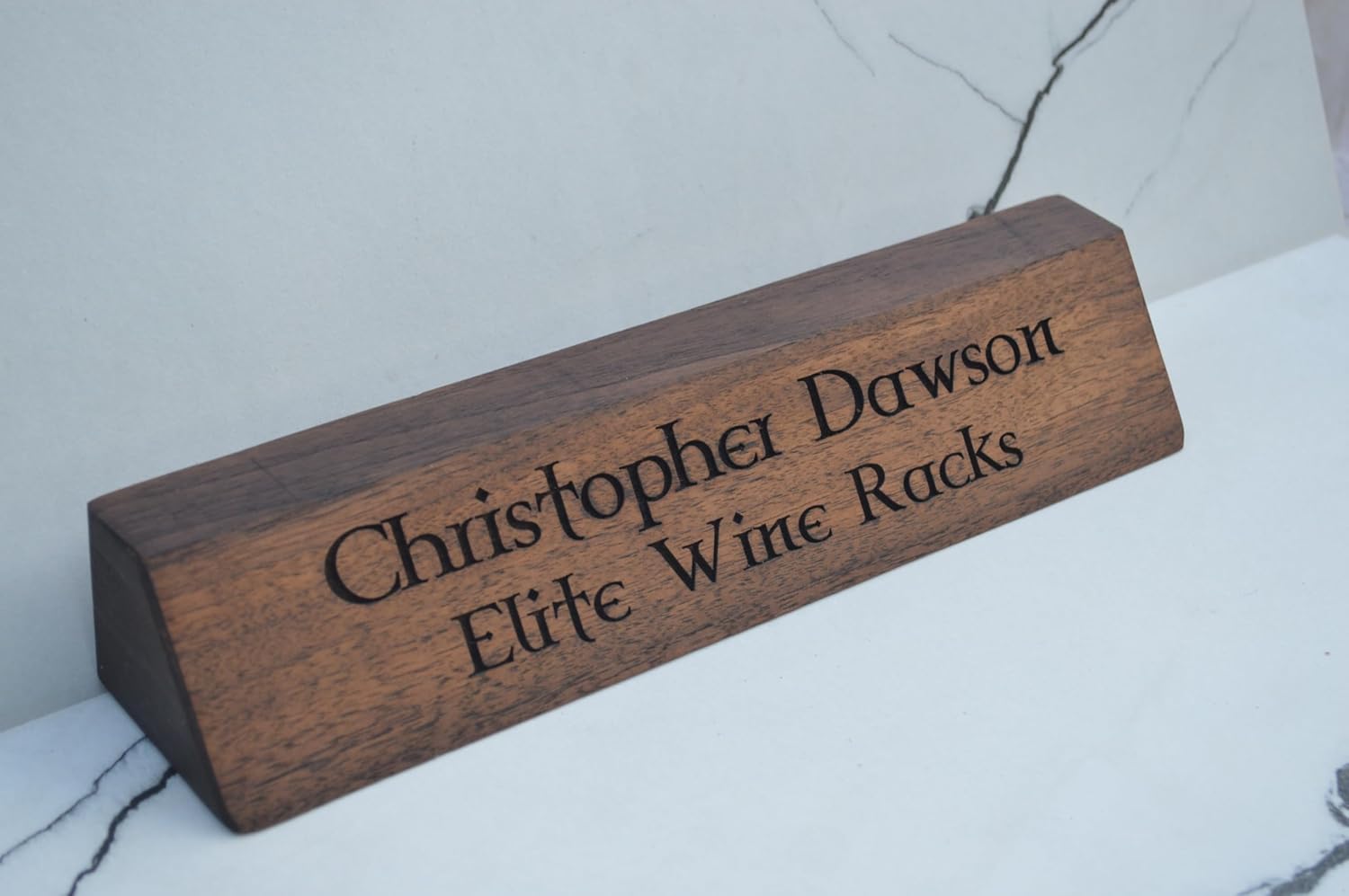 Elevate your professional workspace with this distinguished solid wood desk name plaque. Expertly crafted from premium hardwood, this elegant desk sign features precision-engraved text that adds a touch of sophistication to any office setting. The angular design with its slanted face ensures optimal visibility, while the rich wood grain and warm tones create an inviting, executive appearance. Perfect for reception areas, executive offices, or any professional setting where a polished presentation matters. The substantial construction and classic styling make this name plaque an enduring piece of office decor that commands attention while maintaining understated elegance. Each plaque is carefully finished to highlight the natural beauty of the wood, creating a perfect balance between professional authority and artistic craftsmanship. The clean, crisp engraving ensures clear legibility, making it an ideal choice for professional identification and office organization. A business card holder can be added as well.