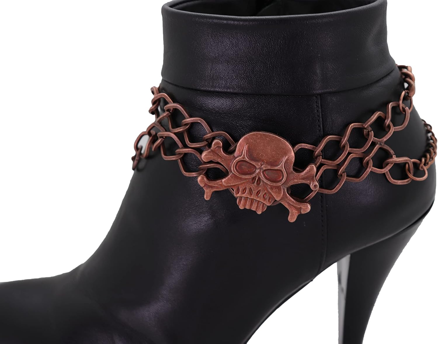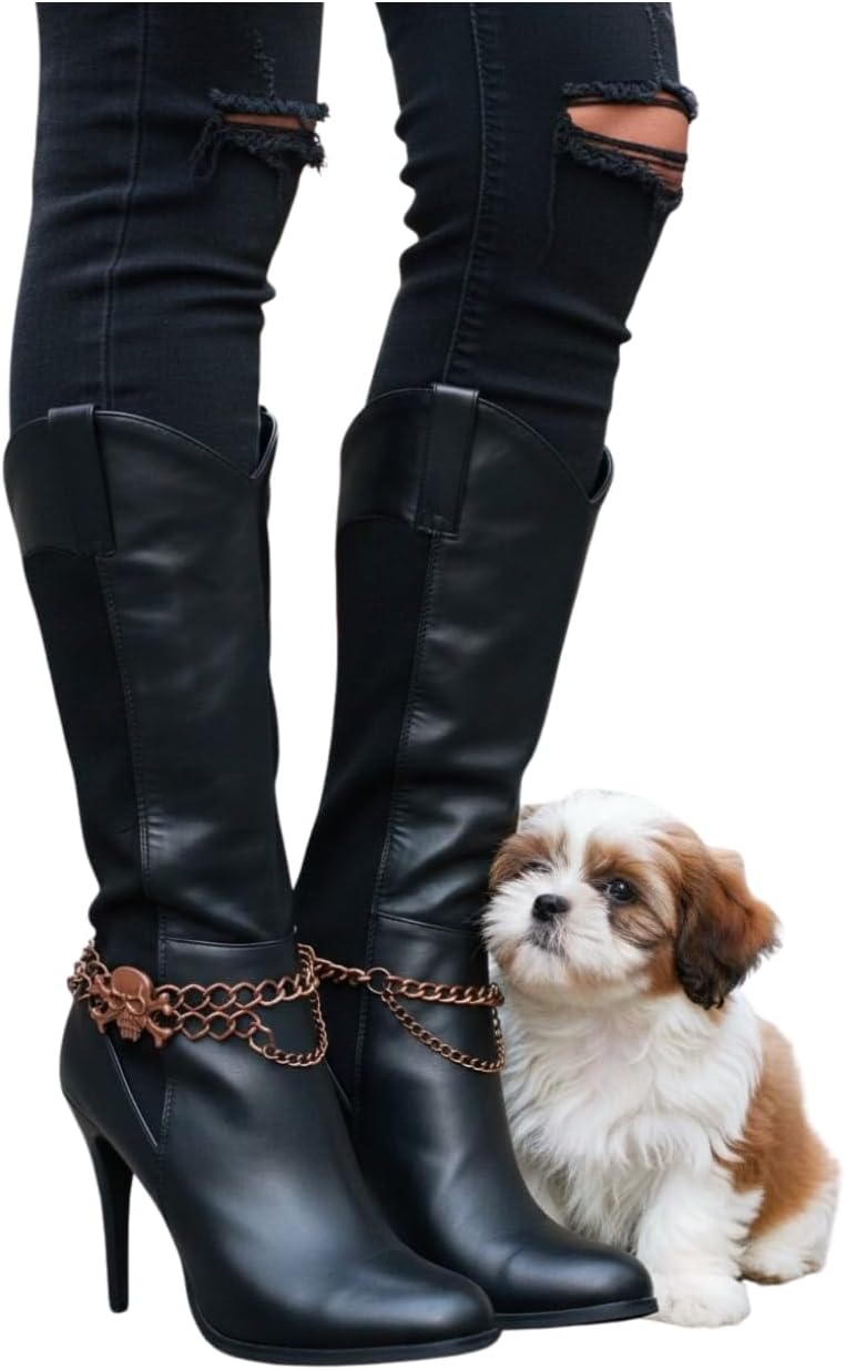 BC101 Some accessories whisper. These boot chains do not. If your outfit has ever needed “one more thing” (but not another belt, not another bag, not another anything), these bronze-tone skull boot chain anklets are the answer. They deliver instant edge with a layered chain look and a bold skeleton skull charm that makes plain boots look intentionally styled. They’re the kind of accessory that makes people think you planned your outfit days in advance—even if it was a five-minute situation and you were still looking for your keys. Fit And Styling Notes: These chains are adjustable 11-15 in, so you can position them around the ankle area or slightly higher on the boot. For best results, wear with a gentle drape instead of a tight wrap. It looks better, feels better, and helps reduce tension.
